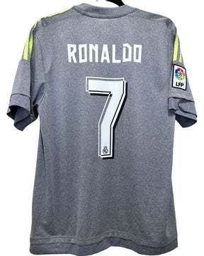 La maglia del Real Madrid per la stagione 2015-16, indossata con il numero 7 da CRISTIANO RONALDO, è realizzata da Adidas in un'accattivante combinazione di colori. Di colore grigio e giallo con la patch della Liga, è ravvivata da nome e numero bianchi che creano un contrasto di colori audace e accattivante evidenziando ulteriormente la grandezza del fenomenale CR7
